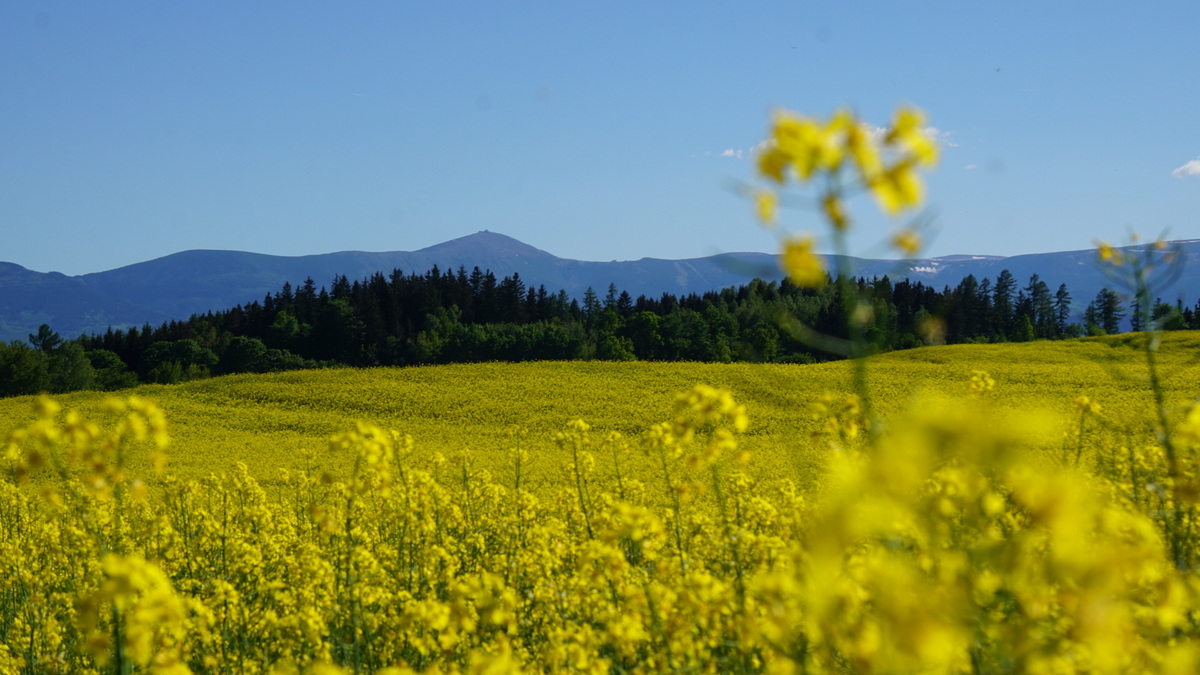 Fotka Panorama Karkonoszy w polu rzepakowym z albumu : Galeria Karpacza i okolic
