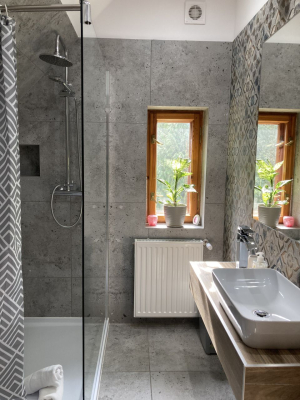 Pokój dwuosobowy z dwoma pojedycczymi łózkami. Umeblowany, starymi, przedwojennymi meblami. Zawiera nowoczesną łazienke z prysznicem. Usytułowany na parterze obok wspólnej kuchni i jadalni. Dostęp do wspólnego tarasu na p